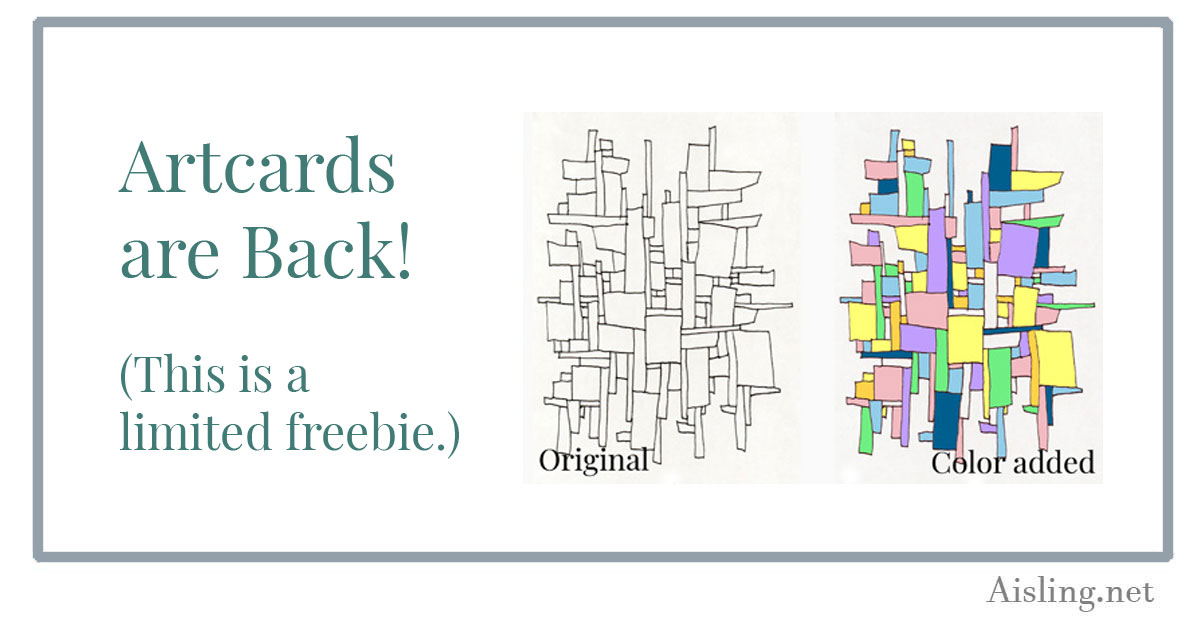 Sooo… I’m (finally) getting back to sending out free artcards. They’re generally around 4″ x 6″. These will look like the image above… the colored version, not the black-and-white one.